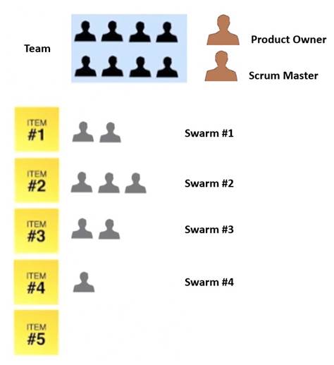 The following diagram shows how swarms form for various items the Team members work on in a Sprint.